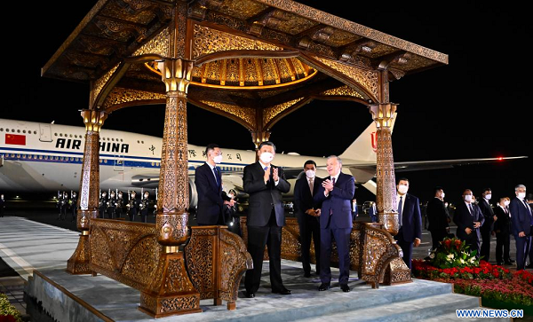 M. Mirziyo?ev a organisé une grande cérémonie de bienvenue en l'honneur du président chinois à l'aéroport. Près d'une centaine de drapeaux nationaux de la Chine et de l'Ouzbékistan flottaient au vent. Le tapis rouge de cent mètres de long était encadré par une garde d'honneur. Les deux présidents sont montés sur une tribune ornée de décorations ouzbèkes caractéristiques. Une fanfare accompagnait la cérémonie au son du karnay, un long instrument à vent traditionnel de l'Ouzbékistan, en signe de bienvenue. Des jeunes locaux, habillés de costumes traditionnels de fête, chantaient et dansaient sur le rythme le plus enthousiaste pour saluer l'invité le plus honorable.