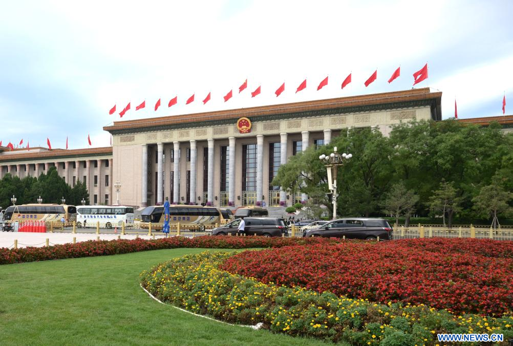Extérieur du Grand Palais du Peuple avant l'ouverture du Sommet 2024 du Forum sur la coopération sino-africaine (FCSA), à Beijing, capitale chinoise, le 5 septembre 2024. Le Sommet 2024 du FCSA s'est ouvert jeudi à Beijing. (Photo : Li He)