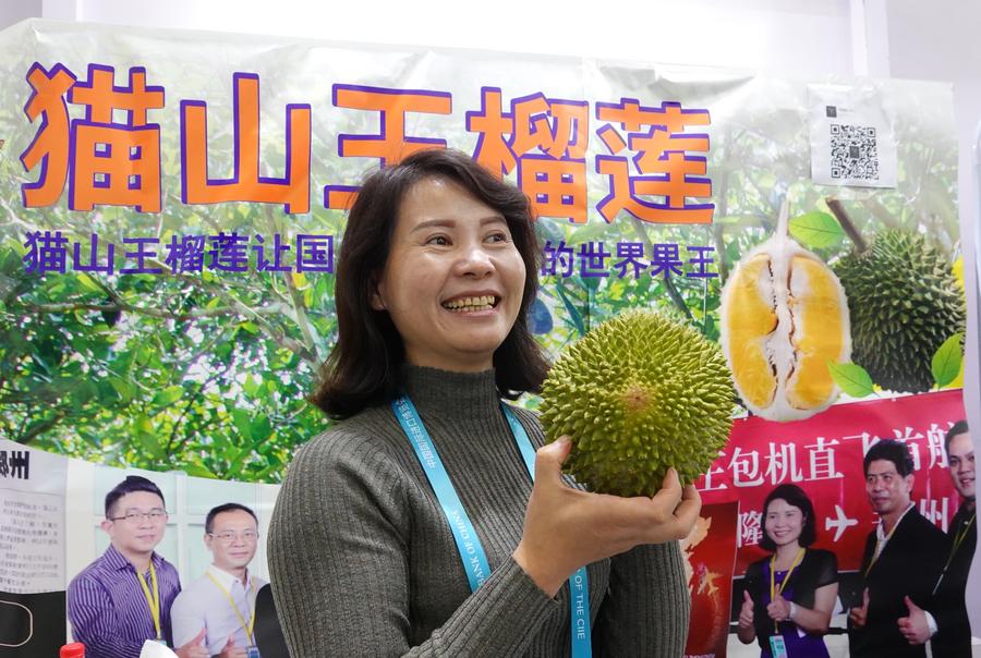 Une membre du personnel montre un durian de Malaisie dans la zone d'exposition des produits alimentaires et agricoles lors de la deuxième Exposition internationale d'Importation de la Chine à Shanghai, dans l'est de la Chine, le 9 novembre 2019. (Xinhua/Cai Yang)