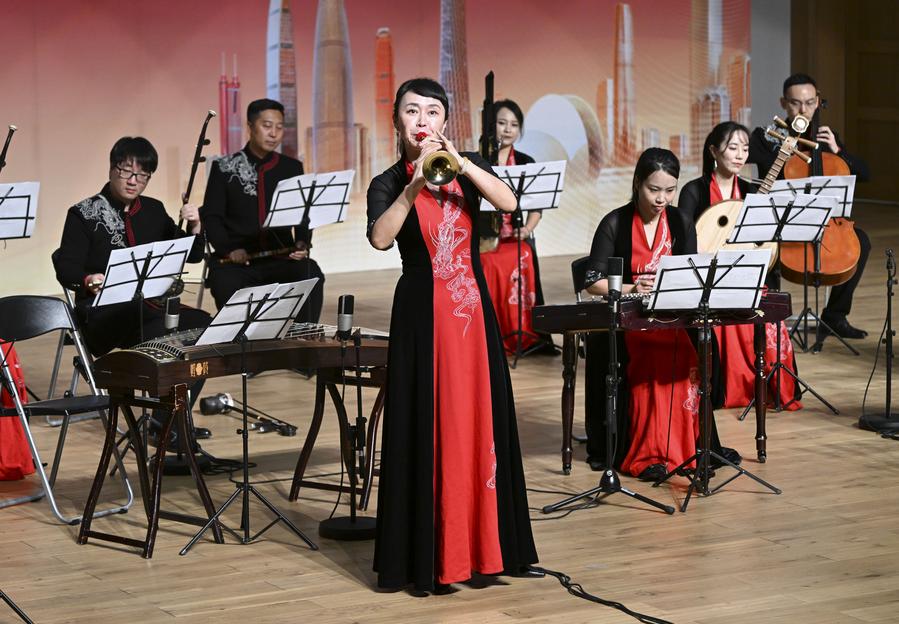 Des artistes se produisent lors du concert baptisé "Rythmes cantonais pour la Route de la soie" au Campus malaisien de l'Université de Xiamen à Selangor, en Malaisie, le 24 novembre 2023. (Xinhua/Cheng Yiheng)