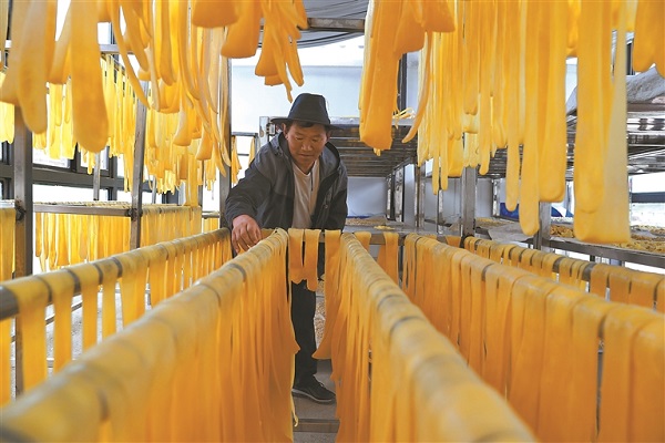 Un éleveur du canton de Mitika, dans le comté de Lhari, à Nagqu, est en train de faire sécher des lamelles de ? lala ?, un produit laitier, dans l'atelier de la coopérative.