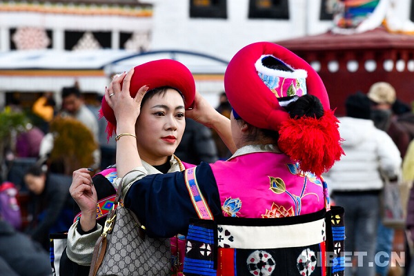 Depuis la mise en ?uvre de la huitième série de politiques préférentielles ? Voyage hivernal au Xizang ?, l'engouement pour un ? Voyage hivernal au Xizang ? ne cesse de cro?tre, attirant un flot continu de visiteurs. Récemment, des touristes originaires de la préfecture autonome tibétaine de Dêqên, dans le Yunnan, vêtus de leurs costumes traditionnels locaux, ont contribué à rendre encore plus éclatante la rue de Barkhor qui a déjà plus de mille ans d'histoire.