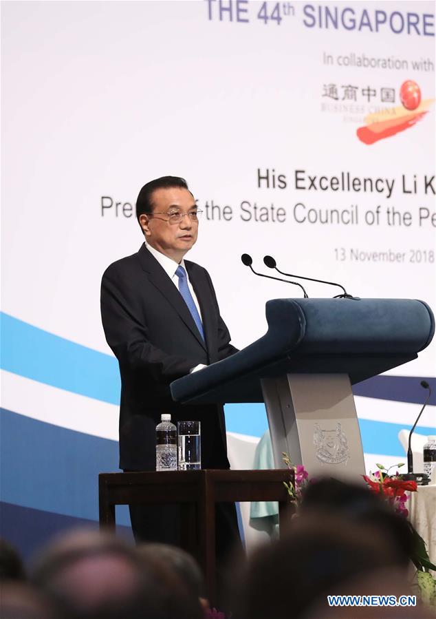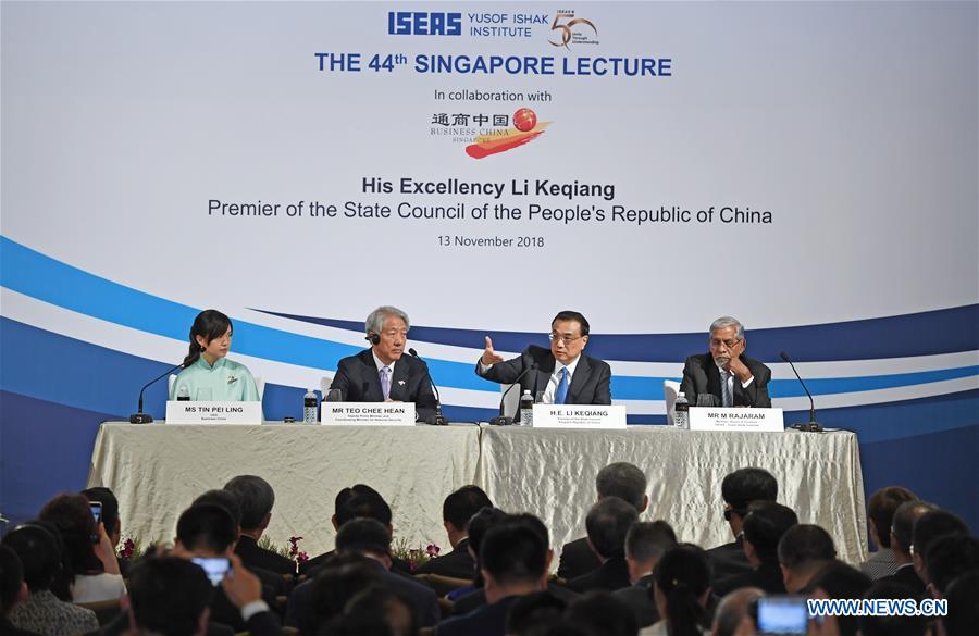 SINGAPOUR, 13 novembre (Xinhua) -- Le Premier ministre chinois Li Keqiang a appelé mardi à des efforts mondiaux pour défendre le libre-échange et le multilatéralisme afin d'atteindre la paix et la prospérité mondiales.