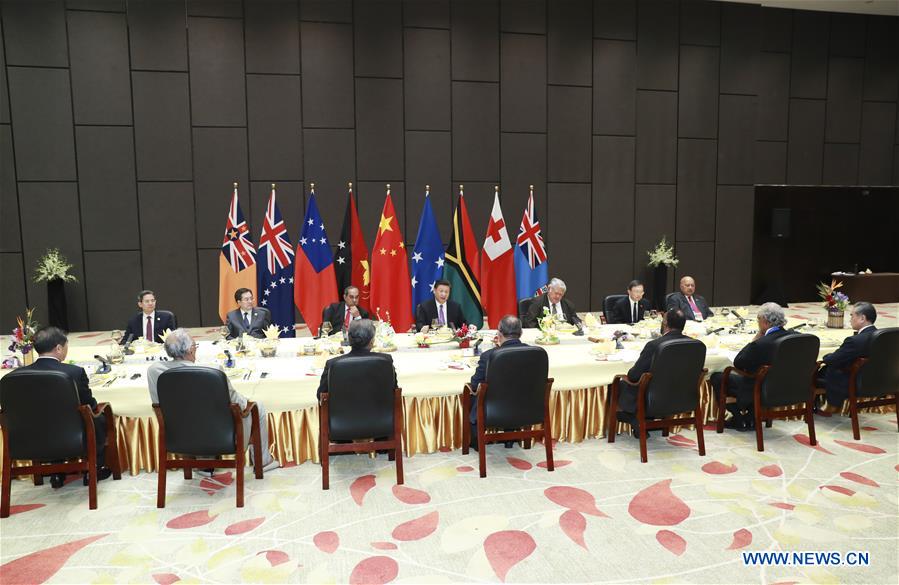 Le président Xi a prononcé le discours liminaire de la réunion collective qui a rassemblé le Premier ministre de la PNG, Peter O'Neill, le président des états fédérés de Micronésie, Peter Christian, le Premier ministre des Samoa, Tuilaepa Malielegaoi, le Premier ministre de Vanuatu, Charlot Salwai, le Premier ministre des ?les Cook, Henry Puna, le Premier ministre des Tonga, Samuela Akilisi Pohiva, le Premier ministre de Niue, Toke Talagi, ainsi que le représentant du gouvernement fidjien, Ratu Inoke Kubuabola, ministre de la Défense du pays.
