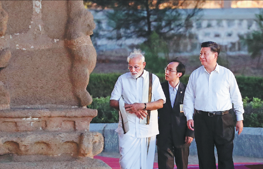 Le président Xi Jinping se promène vendredi avec le Premier ministre indien Narendra Modi après son arrivée à Chennai, en Inde. La visite de M. Xi, qui durera jusqu'à la fin du weekend, comprend un deuxième sommet informel avec M. Modi ainsi que la première visite au Népal d'un président chinois en 23 ans. [XU JINGXING/LA CHINE AU QUOTIDIEN]