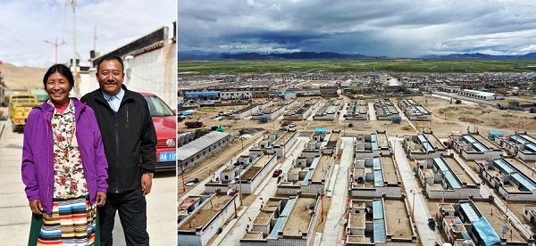 Photo montage montrant, à gauche, le villageois Tsering Dorje et son épouse Nanta au village de Dara dans le district de Zhongba, à Xigaze, dans la région autonome du Tibet (sud-ouest de la Chine) ; et à droite, une vue aérienne du village de Dara, le 29 juillet 2020. (Photo : Zhan Yan)