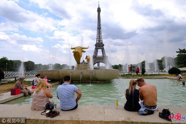 Pour fuir la chaleur, des gens se sont rafraichis le 25 juillet dans la fontaine de la place du Trocadéro, devant la Tour Eiffel, à Paris.