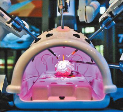 Sur le stand 7.1, Fosun présente son robot chirurgical magique Da Vinci, qui peut facilement couper une petite fleur sans toucher aux étamines des autres fleurs. Il a déjà réussi 100 000 opérations chirurgicales en Chine. (Xiao Wei / China Economic Weekly)