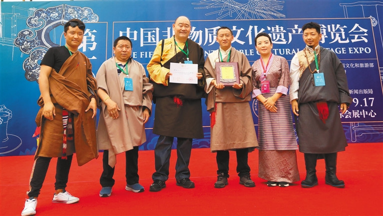 Luobu (troisième en partant de la droite) a participé au concours d'artisanat de broderie organisé par la 5e Exposition du patrimoine culturel immatériel de Chine et a remporté la troisième place.