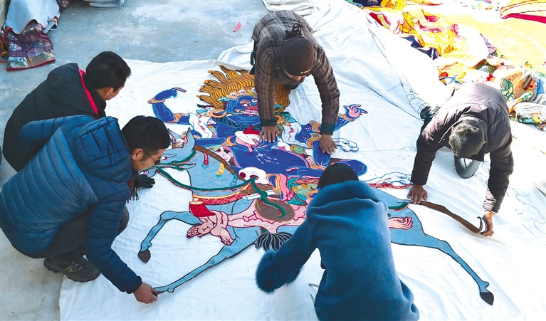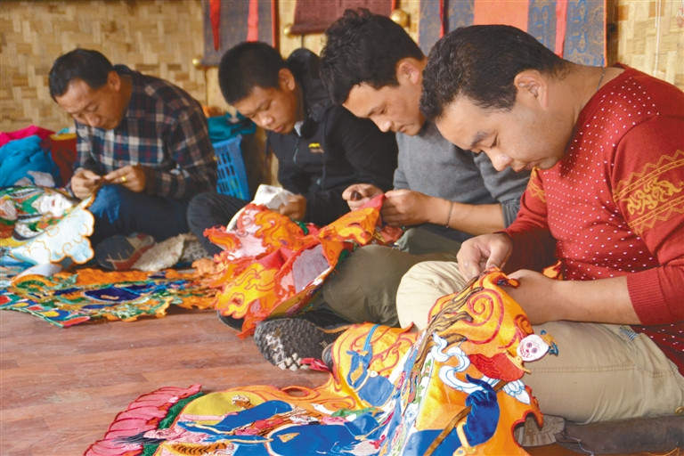 Luobu et ses disciples ont fabriqué un thangka brodé au Centre du patrimoine artisanal ethnique Celinmen à Lhassa.