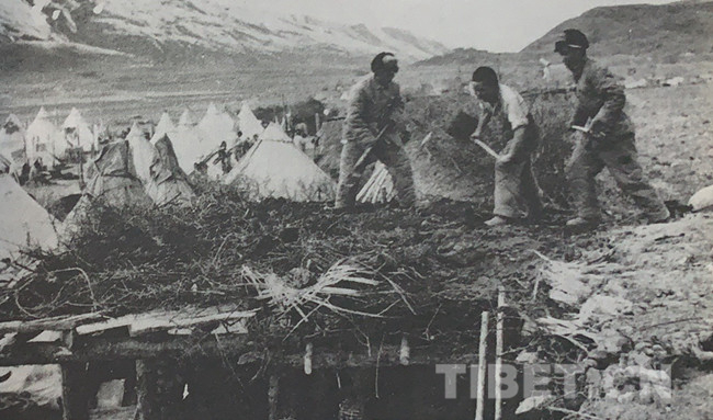 En avril 1951, sur le chantier de l'aéroport de Garzê, les soldats montent des tentes d'hébergement et des maisons simples.