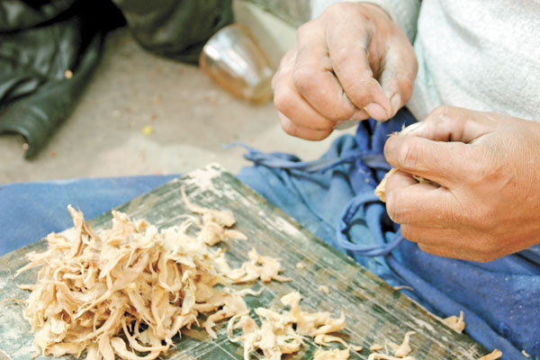 Les racines des Lang Du fibreux après cuisson et élimination complète de leur épiderme dur.