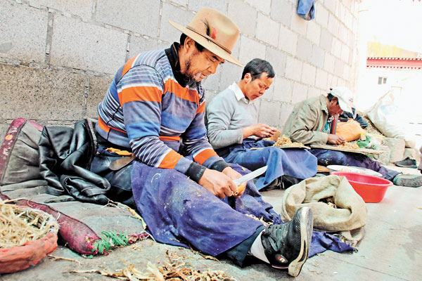 Gesang (au milieu) et les membres de sa coopérative enlèvent l'épiderme et les impuretés des racines de Lang Du, la matière première du papier tibétain.