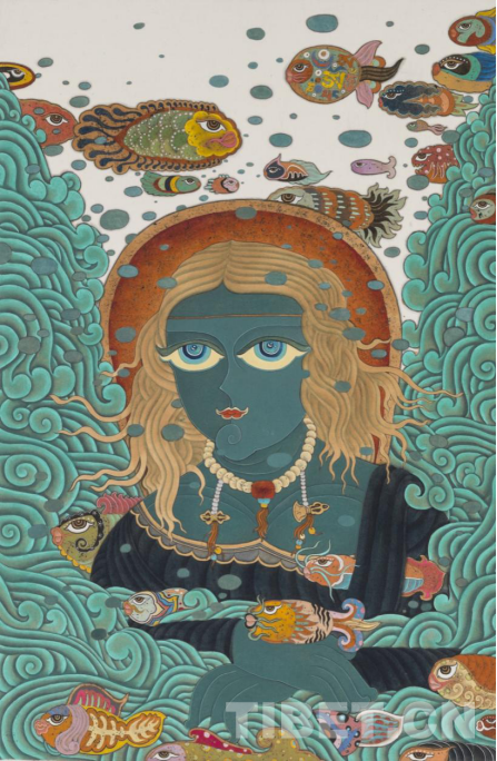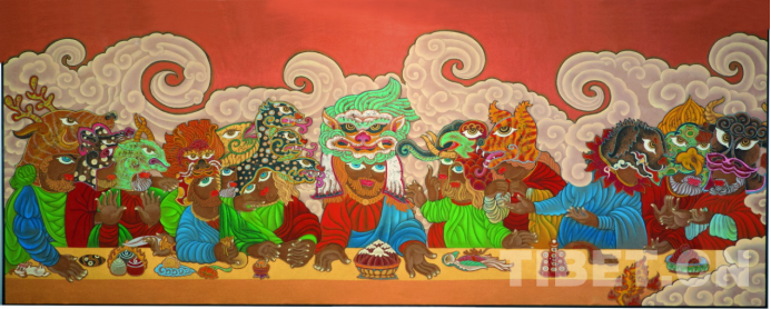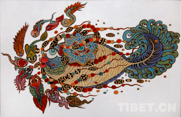? La série ? La remise à l'eau des poissons ? contient mes oeuvres préférées. La version verticale du tableau ? Fish ? a été achevée en 2009 et a été exposée dans plusieurs musées étrangers et dans une galerie en Italie. Ce tableau ? Fish and Gawu box ? raconte une histoire très touchante, qui mentionne des poissons portant la bo?te Gawu, une bo?te bouddhique de bon augure. Dans les deux ?uvres de la série ? La remise à l'eau des poissons ?, on peut trouver des poissons qui portent la bo?te Gawu. Ces ?uvres représentent les gens, dont la demande est excessive et qui s'attirent pression et fardeau. Elles nous apprend que c'est seulement quand on apprend à abandonner que cela devient facile, car quand on omet, on obtient. ? Tout en écoutant la peintre tibétaine Dezhen qui raconte l'intention originelle de sa création, en appréciant les couleurs vives et les fantaisies de ces dessins animés, les visiteurs apprennent comment elle peut faire sortir la richesse de son monde intérieur, ses préoccupations sociales et ses sentiments réels à travers la chaleur au bout de ses doigts.