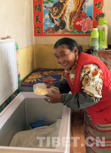En entrant dans la cour de la nouvelle maison de Tsering Namgyal, nous avons vu d'abord une véranda en verre qui mène directement à la maison. En pénétrant dans la salle en verre, vous pouvez sentir la chaleur apportée par la lumière solaire intense. Dans un endroit avec de courtes saisons sans gel tout au long de l'année, comme les caves à glace, vivre dans une maison aussi claire et chaleureuse est quelque chose dont elle n'aurait même jamais rêvé. En particulier, des centrales solaires ont été construites dans les cantons au cours de ces dernières années. Chaque famille a non seulement des lampes électriques, mais aussi des appareils électriques comme la télévision, le congélateur, la machine à laver, etc. La vie a changé qualitativement.