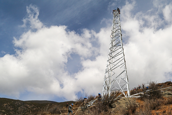 "Hé Lunettes, n'oublie pas de resserrer encore le cable d'acier !" Le 8 avril, sur le site de la ligne de transmission 35 kV de Zhongzan à Suwalong à Batang, dans la préfecture de Garzê, province du Sichuan, à une altitude de 4000 mètres et à mi-chemin sur une montagne, notre gars "Lunettes" se concentre sur le tirage du cable d'acier torsadé.