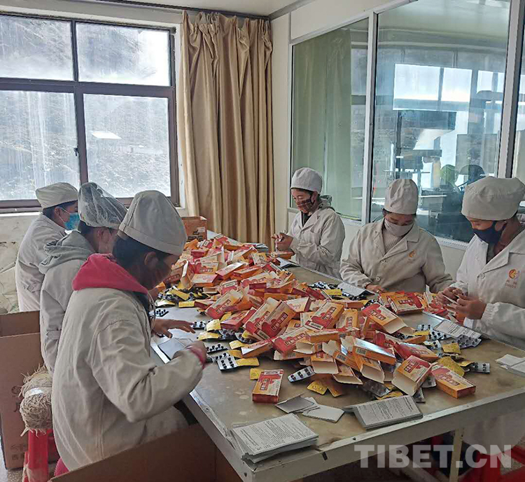 En photo : des employés de la société Tibet Shenhou Pharmacy Co., Ltd emballant les médicaments tibétains.