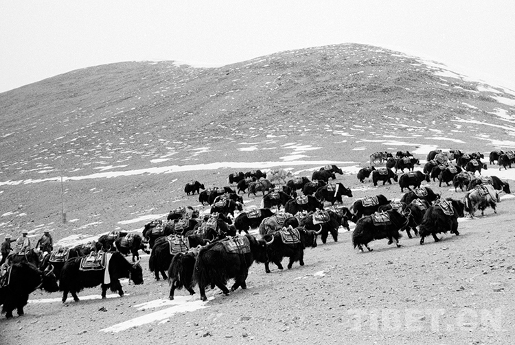 Les bergers conduisent des groupes de bovins pour transporter le sel du lac salé dans les terres désertes du nord du Tibet (photo prise par Tang Zhaoming en 1988).
