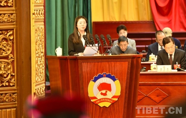 Jiang Miaomiao prononce son discours lors de la quatrième session du douzième Comité de la CCPPC de la région autonome du Xizang.