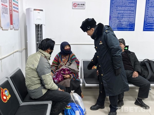 Sur la photo : Sangye Phuntsok, responsable du service passagers de la gare, s'entretient avec des voyageurs.