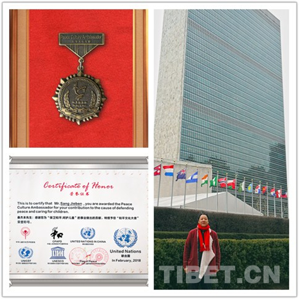 M. Sangye Ben, directeur exécutif de l'Institut de recherche de l'Académie nationale de l’art des thangkas, en raison de ses contributions exceptionnelles à la cause de la paix et à ? la protection de la paix et la protection des enfants ?, a re?u le titre ? d’ambassadeur pour la culture mondiale de la paix ?.