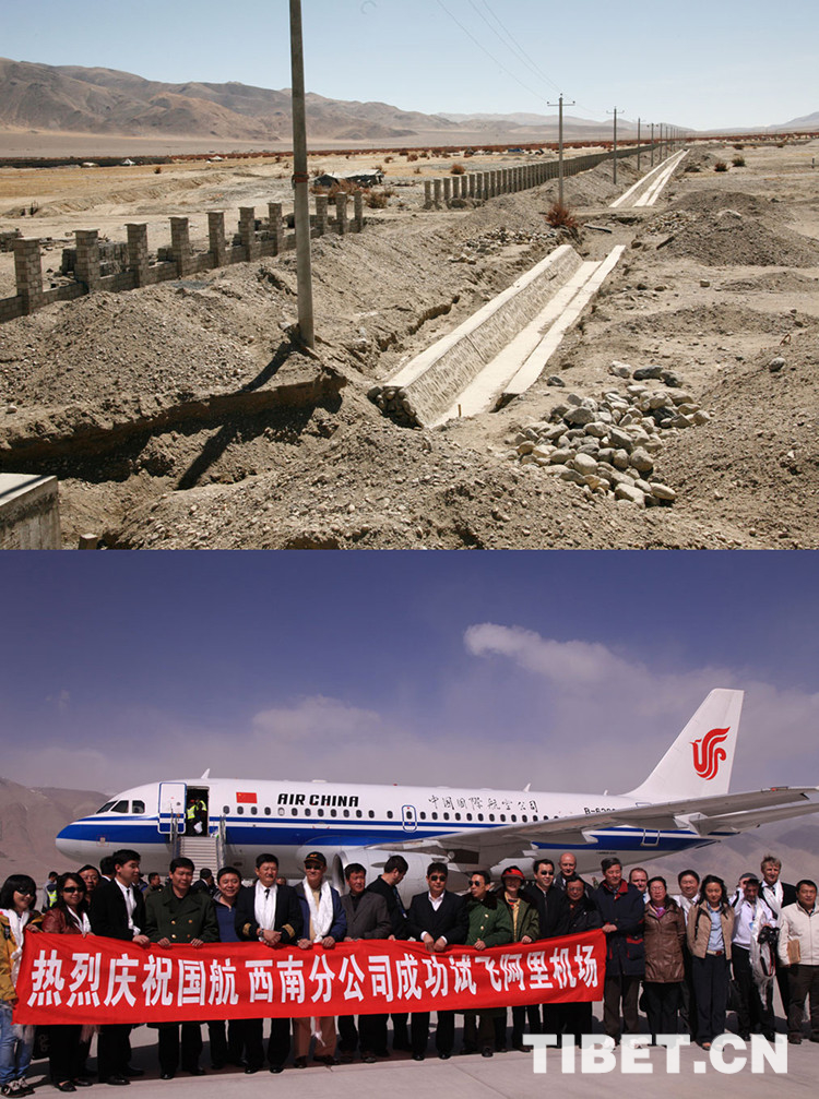 L’aéroport de Kunsha de Ngari en 2005 et en 2007.