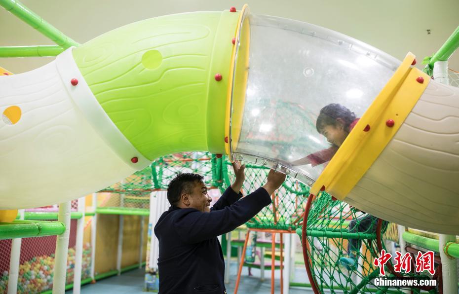 Gasong et sa fille sur un terrain de jeux à Yushu. Il ne peut rentrer chez lui qu’une fois par semaine.
