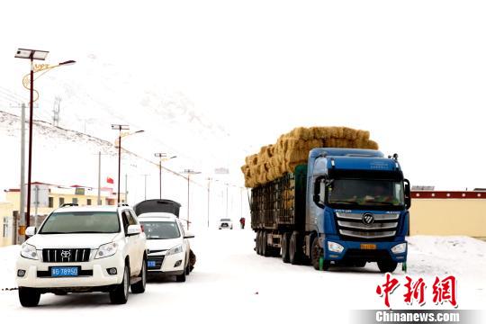 Une semi-remorque qui transporte des matières fourragères dans le canton de Zhaqing, dans le comté de Zaduo, au Qinghai.