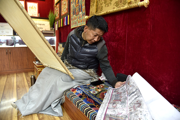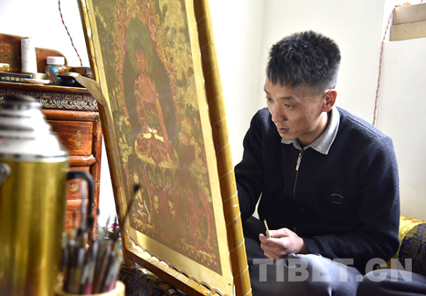 Le Peintre Tenzin peint un Thangka pour la médecine tibétaine.