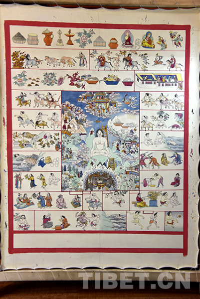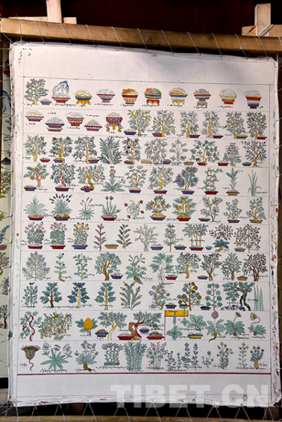Assis les jambes croisées, Jigme et Tenzin s'immergent dans l'imagination de la toile devant eux. Les contours détaillés du squelette humain, des instruments médicaux et des herbes de plateau dans les livres de médecine tibétaine sont esquissés à l'aide des pinceaux très fins, puis les contours sont complétés lentement en détail, et colorés un par un selon le plan. Après de multiples coups de pinceaux, une toile de 60*75 cm a été remplie de plus de 80 petits dessins. S'ils avaient le moindre doute, ils se tournaient vers des livres précieux qui leur servaient de référence.