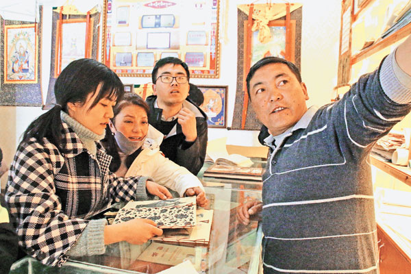 Dans la salle d'exposition des produits de la coopérative, les membres présentent aux visiteurs les produits faits de papier tibétain.