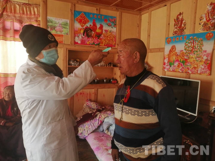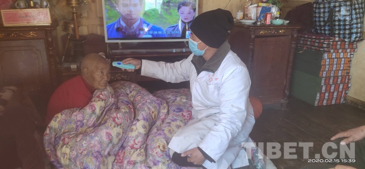 Ngawang est revenu de Chengdu le 5 février, De retour au village, il a été isolé chez lui. ? Qu'est-ce qui ne va pas maintenant? Pas de maux de tête? De la toux? ? Chinai mesure la température corporelle de Ngawang, qu'il note dans un grand livre de travail en détail, tout en observant et le questionnant sur son état. Ensuite, il fait le même examen pour les cinq autres personnes de la famille de Ngawang. ? Depuis mon retour, Chinai est devenu notre médecin de famille. Malgré le vent et la neige, t?t et tard en soirée, il vient trois fois par jour pour nous examiner ?, dit de Ngawang.
