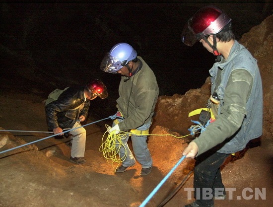 La grotte se trouve sur le flanc de la colline à environ 70 mètres du sol. En plus de transporter notre propre équipement, nous devons aussi soulever le générateur à essence, des dizaines de faisceaux de cables et des lampes antidéflagrantes. Ce n'est pas facile, même sur un terrain plat, et encore moins dans un endroit où l'oxygène n'est qu'à la moitié du niveau normal. Heureusement, la majorité des membres de l'équipe de recherche scientifique sont des Tibétains. Ils ont une grande capacité d'adaptation au plateau. Nous avons travaillé ensemble et avons finalement déplacé tout l'équipement dans la grotte.
