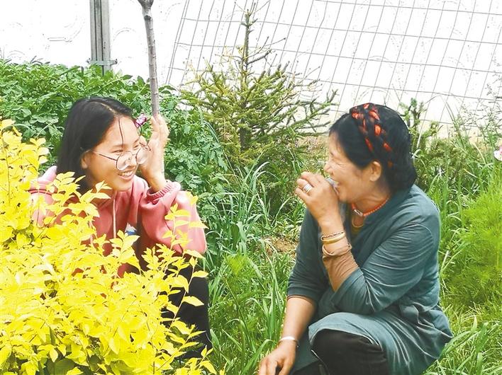 En photo : Tamdrin cause avec sa mère dans le jardin potager devant leur maison.