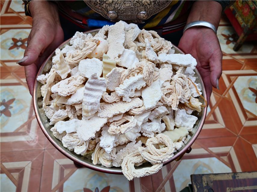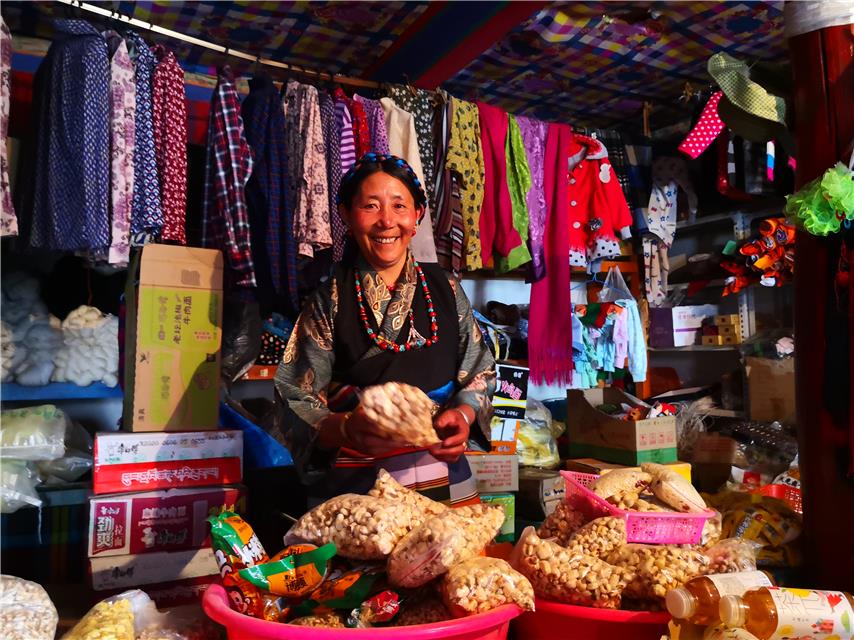 ? La maison a été construite en 2015. Elle couvre une superficie de plus de 400 mètres carrés. Le deuxième étage est utilisé pour la vie quotidienne, et au premier étage se trouvent notre boutique et le salon de thé. ? Tsering Dondrup a dirigé le premier magasin du village il y a 18 ans. Sa taille est également en expansion. Avec la mise en ?uvre du projet de construction d'une société de bien aisance à tous les égards dans les villages ces dernières années, il y a de plus en plus de travailleurs étrangers dans le secteur de la construction. Tsering Dondrup a donc ouvert un salon de thé. En 2019, le revenu familial de Tsering Dondrup a atteint plus de 100 000 yuans (environ 12 600 euros).