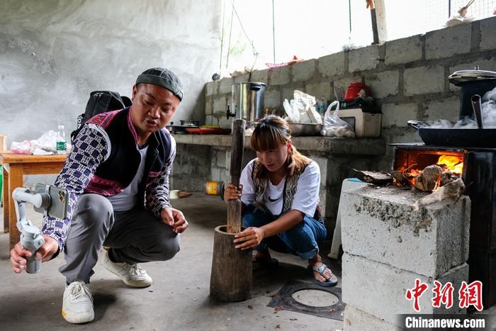 En photo : Dilong (à gauche) filmant le processus de la fabrication de la sauce du piment traditionnelle par une habitante de Zayü, le 13 mai.