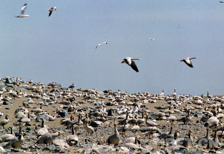 Des oies à tête barrée et des goélands qui vivent sur l'?le aux oiseaux d'Eyartso (Photo de Tang Zhaoming en 2009).