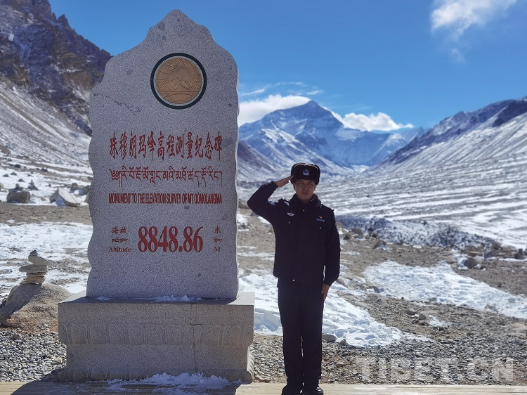 En photo : Kalsang, directeur du poste de police frontalier de Qomolangma du détachement de gestion frontalière de Shigatsé de la région autonome du Tibet.