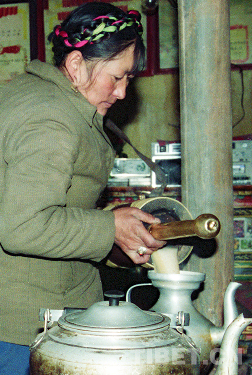 Une ouvrière de maintenance de la section 109 d'Amdo de la route Qinghai-Tibet versant du thé au beurre fra?chement battu dans la théière. (Photo : Tang Zhaoming, 1991)