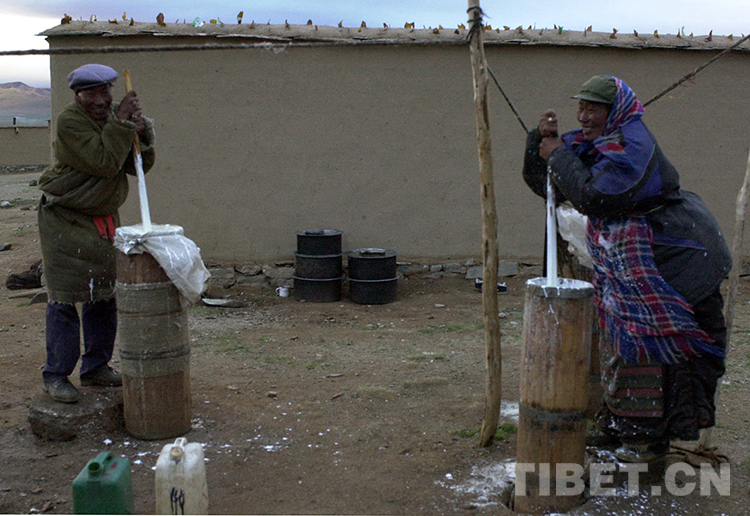Des bergers dans le canton de Gyatso, dans la zone spéciale de Shuanghu, préfecture de Nagqu, (aujourd'hui le comté de Shuanghu de la ville de Nagqu), fabriquant du beurre. (Photo : Tang Zhaoming, le 15 juillet 2001)