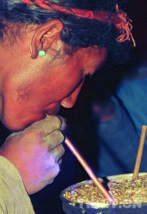 Un berger su?ant du vin d'orge fra?chement brassé, dans le comté de Dingri, préfecture de Shigatsé (aujourd'hui la ville de Shigatsé). (Photo : Tang Zhaoming, 1988)