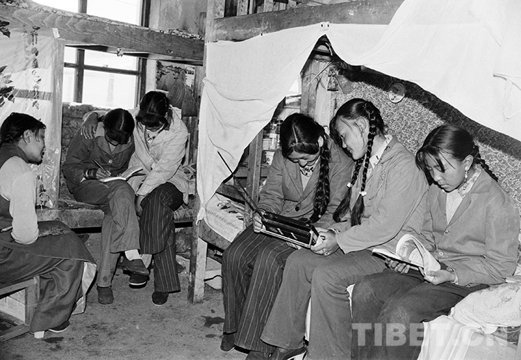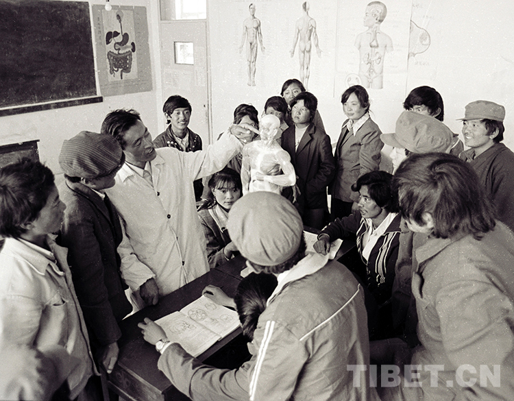 Un enseignant donne une le?on aux élèves de la classe de santé d'une école secondaire spécialisée, dans la région de Nagqu au Tibet (aujourd'hui la ville de Nagqu).(Photo : Tang Zhaoming, 1985)