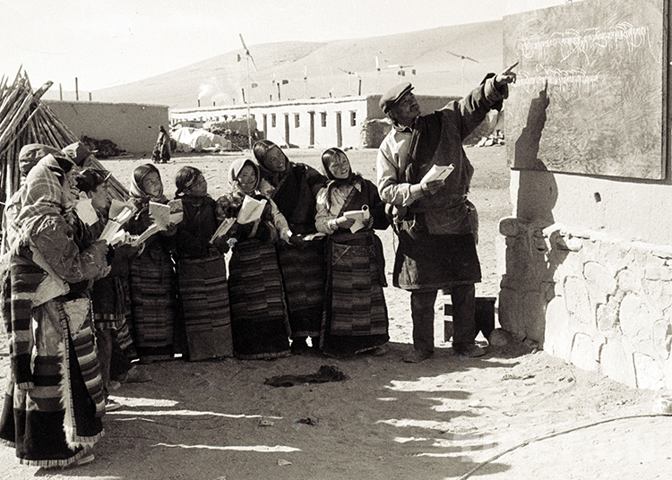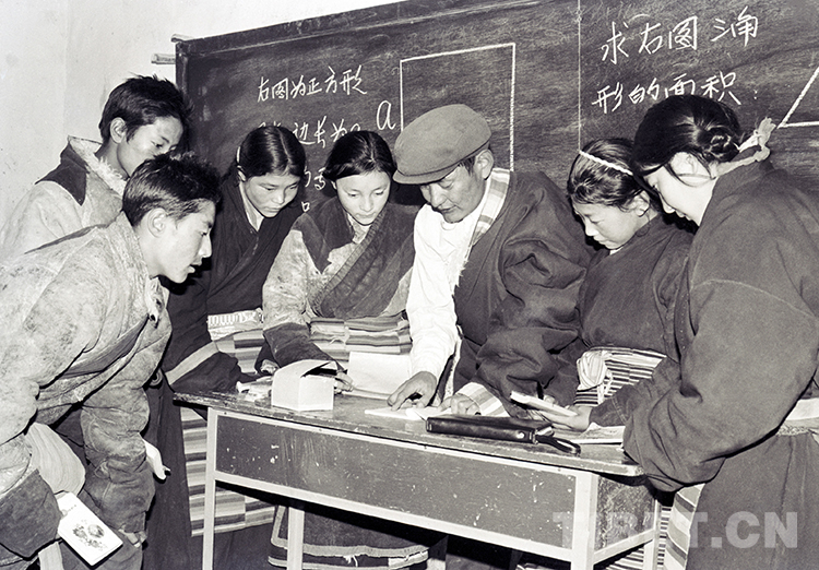 Le directeur de l'école primaire du comté de Bangoin, Xainchoy Gyaltsen, donnant une le?on à ses élèves. (Photo : Tang Zhaoming, 1985)