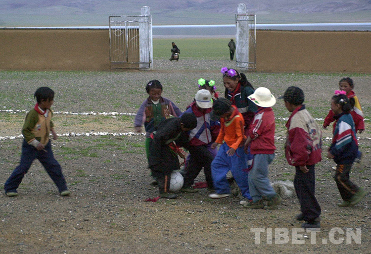Des élèves de l'école primaire du canton de Gyatso du district spécial de Shuanghu (ancien Bureau de Shuanghu, aujourd'hui comté de Shuanghu) jouant au football pendant la récréation. (Photo : Tang Zhaoming, 2001)