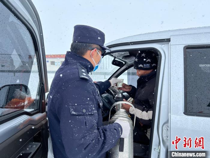 En photo : la police du poste frontière de Mayouqiao fournit de l'eau chaude aux passagers bloqués.