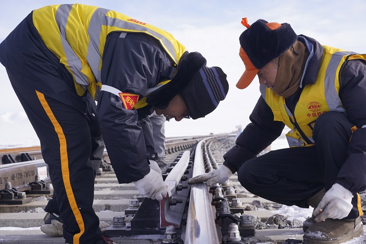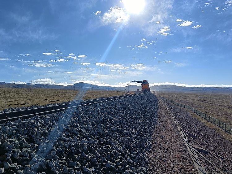 En photo : La section de maintenance de la ligne ferroviaire Qinghai-Xizang, entre la gare de Tanggula Sud et la gare de Liantonghe, assurée par China Railway 12th Bureau Group, se situant en moyenne à une altitude de 4700 mètres. Photo fournie par Yang Bin.