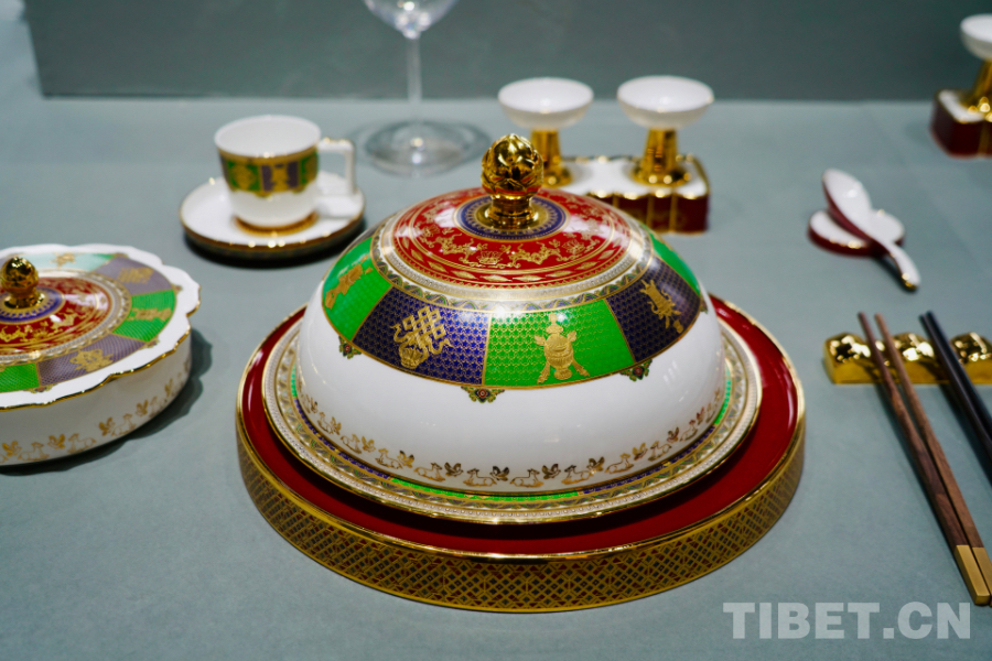 En photo : des couverts en porcelaine d'os de yak ornés de peintures représentant les huit symboles auspicieux tibétains.