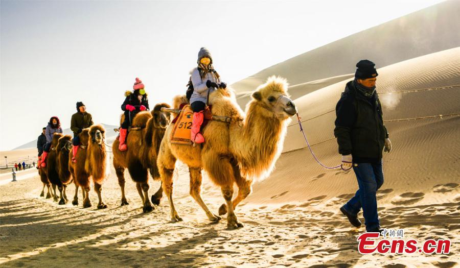 Des touristes venus de toute la Chine bravent le froid pour visiter les sites pittoresques de la Source du Croissant et des Dunes de sables chantants, situés dans la ville de Dunhuang, dans la province du Gansu (nord-ouest de la Chine). Faire une promenade à dos de chameau dans le désert est devenu une activité très prisée des visiteurs.