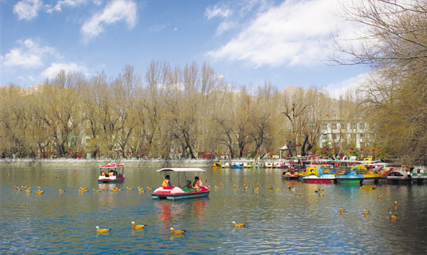 Nourrir les oiseaux migrateurs, prendre des photos, faire des exercices matinaux, marcher... Les visiteurs ont apporté beaucoup de vitalité et d’animation au parc Dzongyab Lukhang. La surface de la glace est dégelée et les attractions sur l’eau sont populaires. Les enfants jouent à la ? balle qui marche sur l'eau ?. Les parents prennent des photos et tirent des cordes. Plusieurs citoyens partent en croisière pour observer de près les oiseaux migrateurs. Ces ? balles qui marchent sur l'eau ? et ces bateaux forment un paysage magnifique sur le lac.