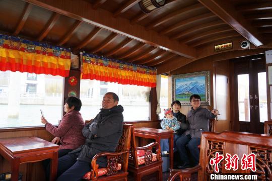 Des habitants et des touristes de Lhassa sont sur un bateau de plaisance.